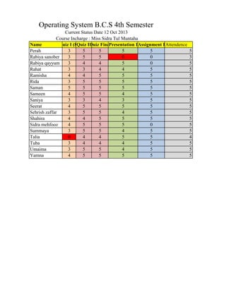 This document contains a table with the names of students in a class and their scores on various assessments: Quiz I, Quiz II, Quiz Final, Presentation I, Assignment I, and Attendence. There are 38 students listed with their individual scores on each assessment. The document also lists the course as Operating System, indicates it is for BCS 4th Semester students, and names the course incharge as Miss Sidra Tul Muntaha. It is dated 12 Oct 2013.