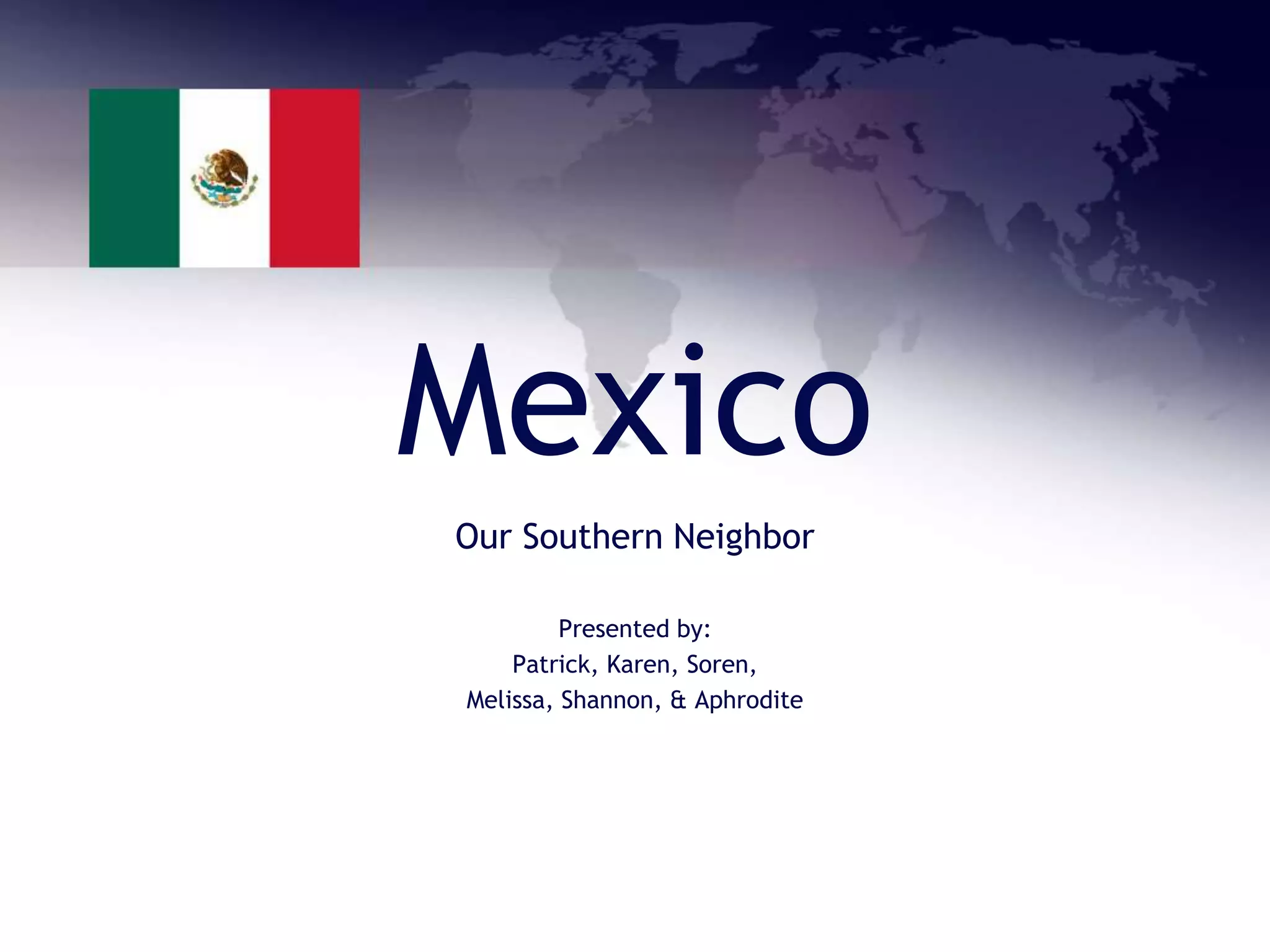 This document provides an overview of Mexico, including its history, demographics, economy, religion, tourism industry, and traditional foods. It notes that Mexico has a long history, with early civilizations including the Olmecs, Mayans, and Aztecs. Today, over 111 million people live in Mexico, with a literacy rate over 90%. Mexico has a large trade economy and exports oil, cars, and other manufactured goods mostly to the US and Canada. While tourism is a major industry, it faces challenges from drug cartel violence and safety issues. Traditional Mexican cuisine was influenced by the Mayans, Spanish, and French colonizers.