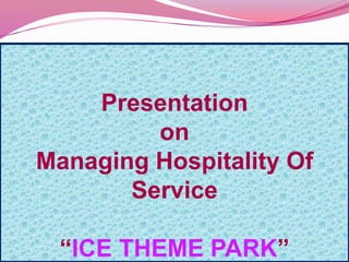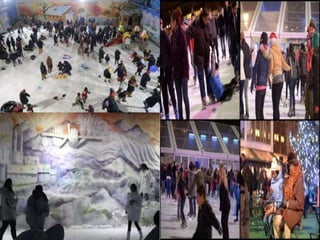 This document provides information about Ice Theme Park, including details about its snow park. It summarizes the park's hours of operation, payment methods, year established, attractions, and food court. The snow park covers over 3.5 lakh square feet and maintains a temperature of -5 degrees Celsius to allow visitors to enjoy playing in snow anytime. It is one of the most popular amusement parks in Ahmedabad.