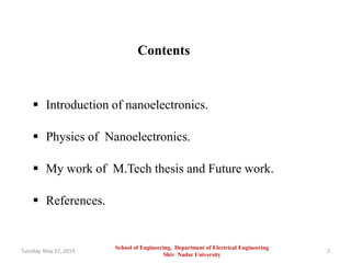 This document summarizes Praveen Dwivedi's M.Tech thesis on modeling silicon nanowire mobility and resistance under the guidance of Dr. Sitangshu Bhattacharya. It introduces nanoelectronics and discusses the physics of nanodevices using the Landauer-Datta model. It also describes modeling silicon nanowire characteristics like electrical resistance and mobility by considering scattering mechanisms like lattice scattering and intervalley scattering. The document outlines Dwivedi's work on developing analytical models to determine the role of first-order intervalley scattering in silicon nanowire electrical resistance.
