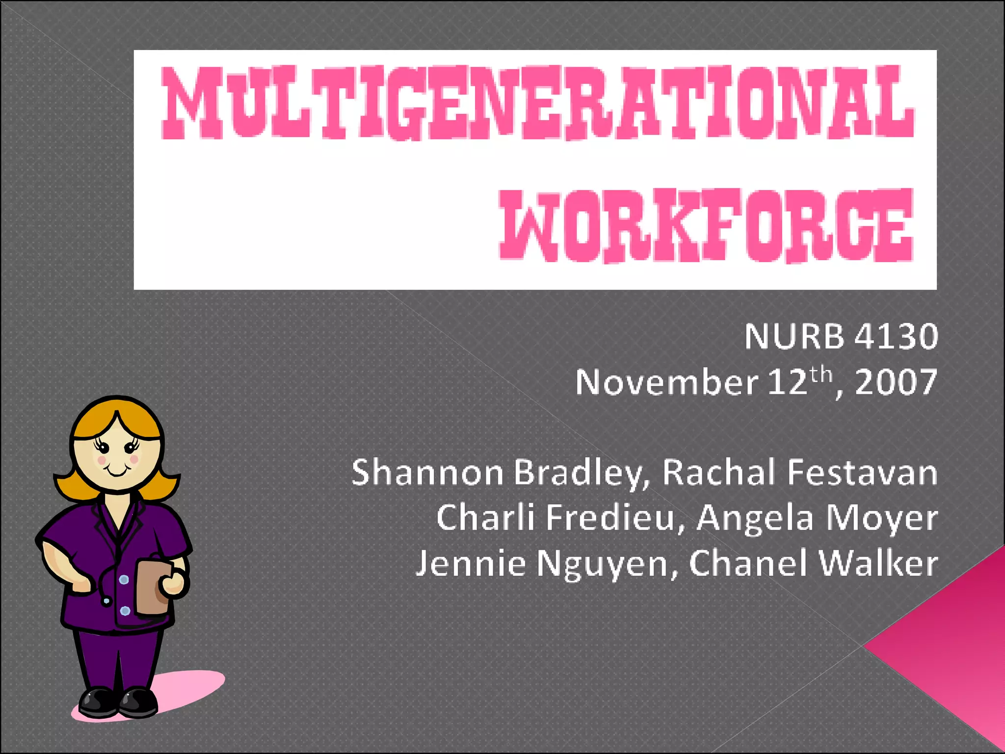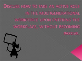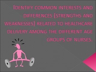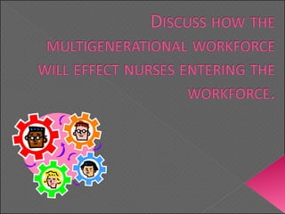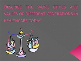 The document discusses managing a multigenerational workforce in healthcare. It describes the different generations currently in the workforce - Veterans, Baby Boomers, Generation X, and Millennials - and their defining characteristics, work ethics, and views. It provides tips for fostering cooperation across generations by understanding differences, respecting each other, maximizing strengths, and ongoing learning. Managing a diverse workforce requires flexibility to address changing needs and a shared focus on patient care.