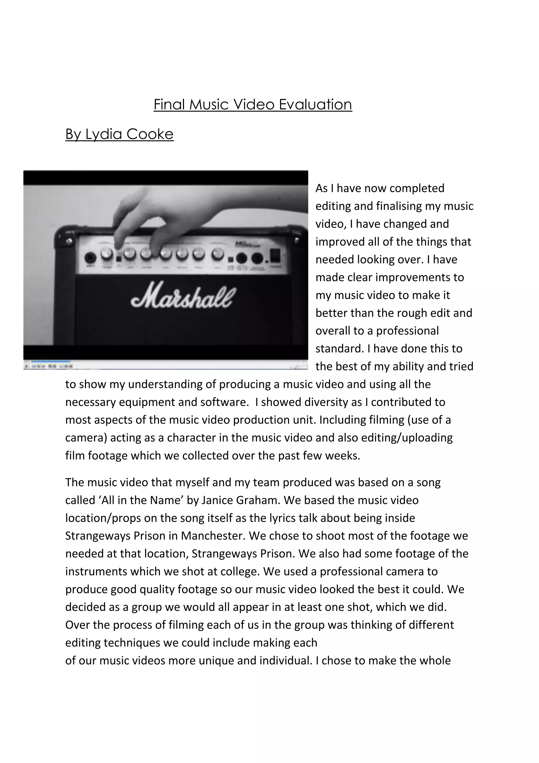 Lydia completed editing her music video for the song "All in the Name" by Janice Graham to a professional standard. She filmed at Strangeways Prison based on the song's lyrics and used editing software to add effects like black and white. She met weekly with her group to discuss the video, including the location, budget, and each member's ideas. Through editing techniques, she structured a narrative and ensured the timing matched the song. In the end, she was happy with the improvements made and felt the video represented her understanding of music video production.