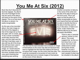 This document summarizes and analyzes the album artwork and packaging of the 2012 You Me At Six live album "The Final Night of Sin". Key points: