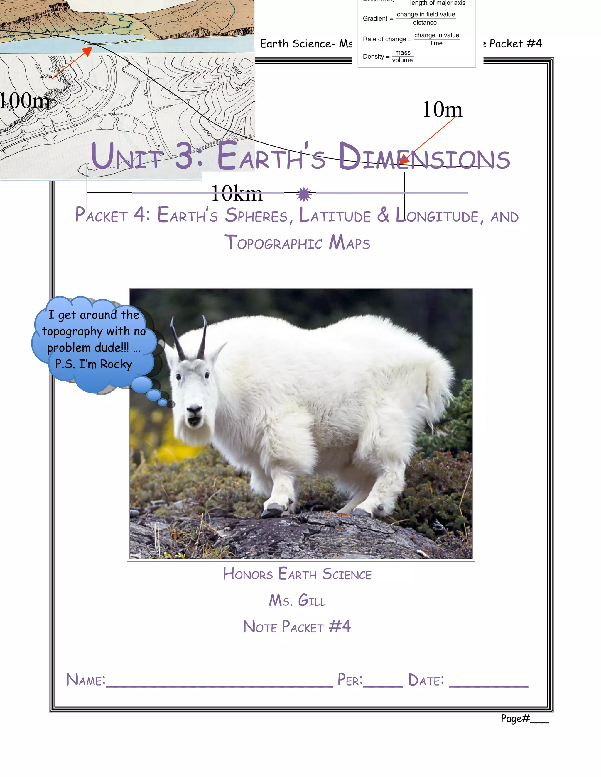 This document is a note packet from an Earth Science class covering various topics related to Earth's dimensions. It includes sections on Earth's spheres, latitude and longitude, and topographic maps. The packet provides definitions of key vocabulary terms and explanations of concepts like map projections, coordinate systems, and time zones. It also contains practice problems for students to complete. The overall document serves as a study guide outlining important dimensional characteristics of Earth.