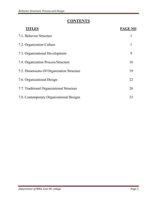 The document discusses organizational structure and process. It states that an organizational structure consists of activities like task allocation, coordination, and supervision that are directed toward achieving organizational goals. The structure determines how an organization operates and performs. An organization can be structured in different ways depending on its objectives. The structure will impact the processes and functions of the organization.