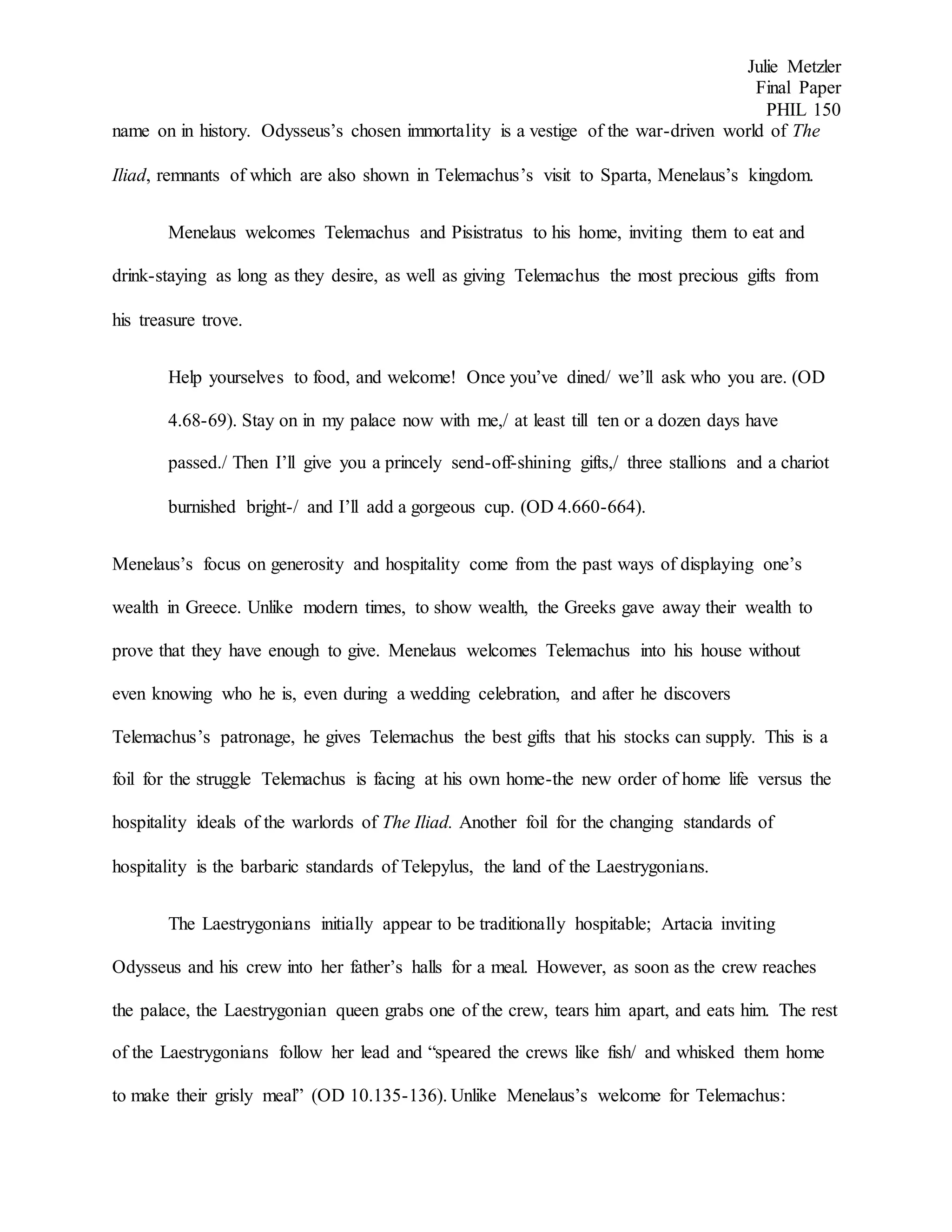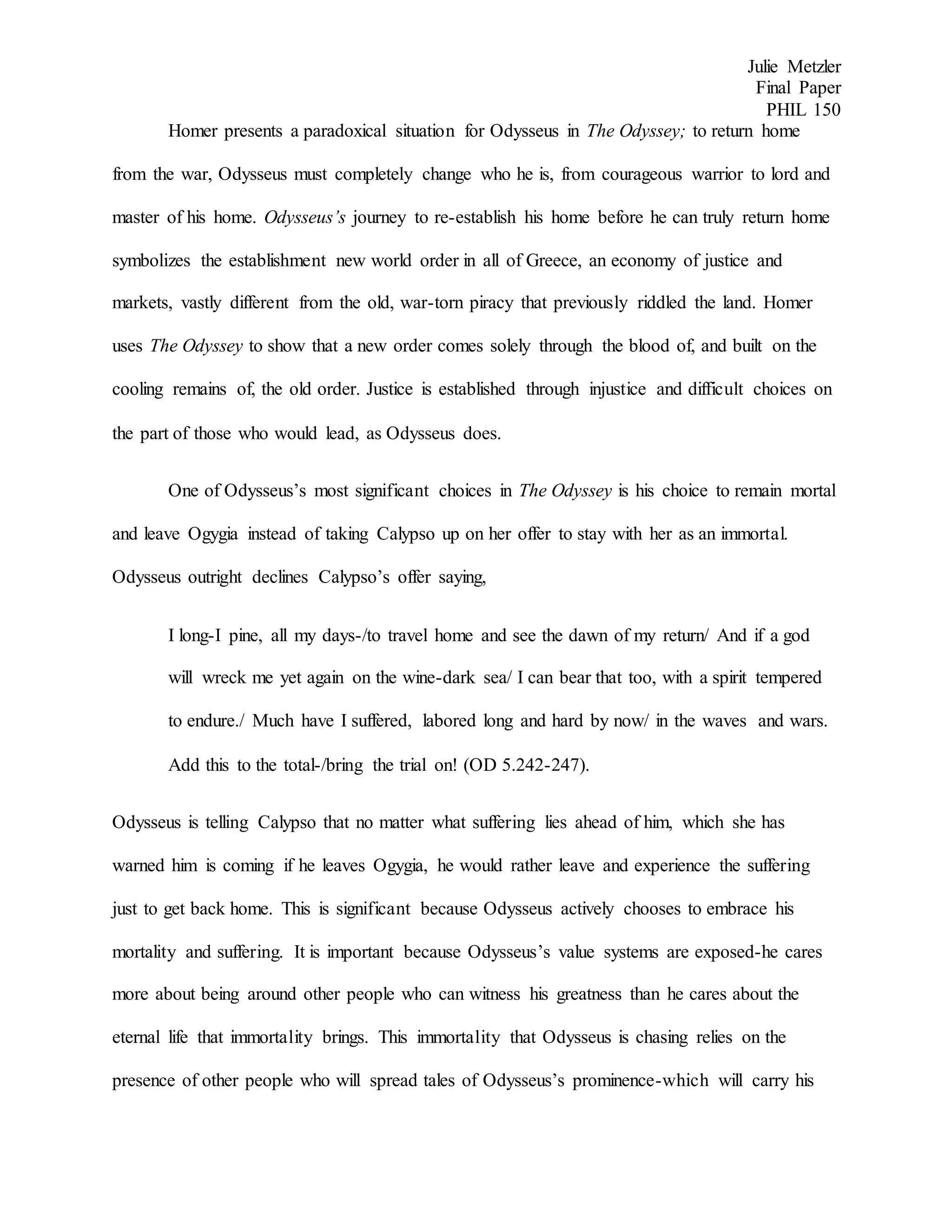 This document analyzes Homer's Odyssey and how it depicts the transition from the old world order of war and piracy to a new order of justice and established economies. It argues that Odysseus must fully reclaim his identity as a warrior and master of his household in order to complete his journey home. His violent acts of slaughtering the suitors and disloyal servants serve to purge his household of threats and establish his rule, thereby spearheading the transition to the new just order blessed by Zeus.