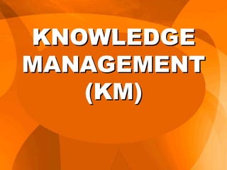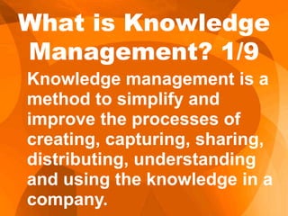 Knowledge management (KM) refers to identifying and leveraging the collective knowledge in a company to help it compete. KM is a discipline focused on systematically managing the generation, acquisition, exchange, distribution, and utilization of knowledge, intellectual capital and intangible assets to improve organizational performance. Effective KM enhances business performance by designing tools, processes, systems, structures and cultures to improve the creation, sharing and application of critical knowledge.