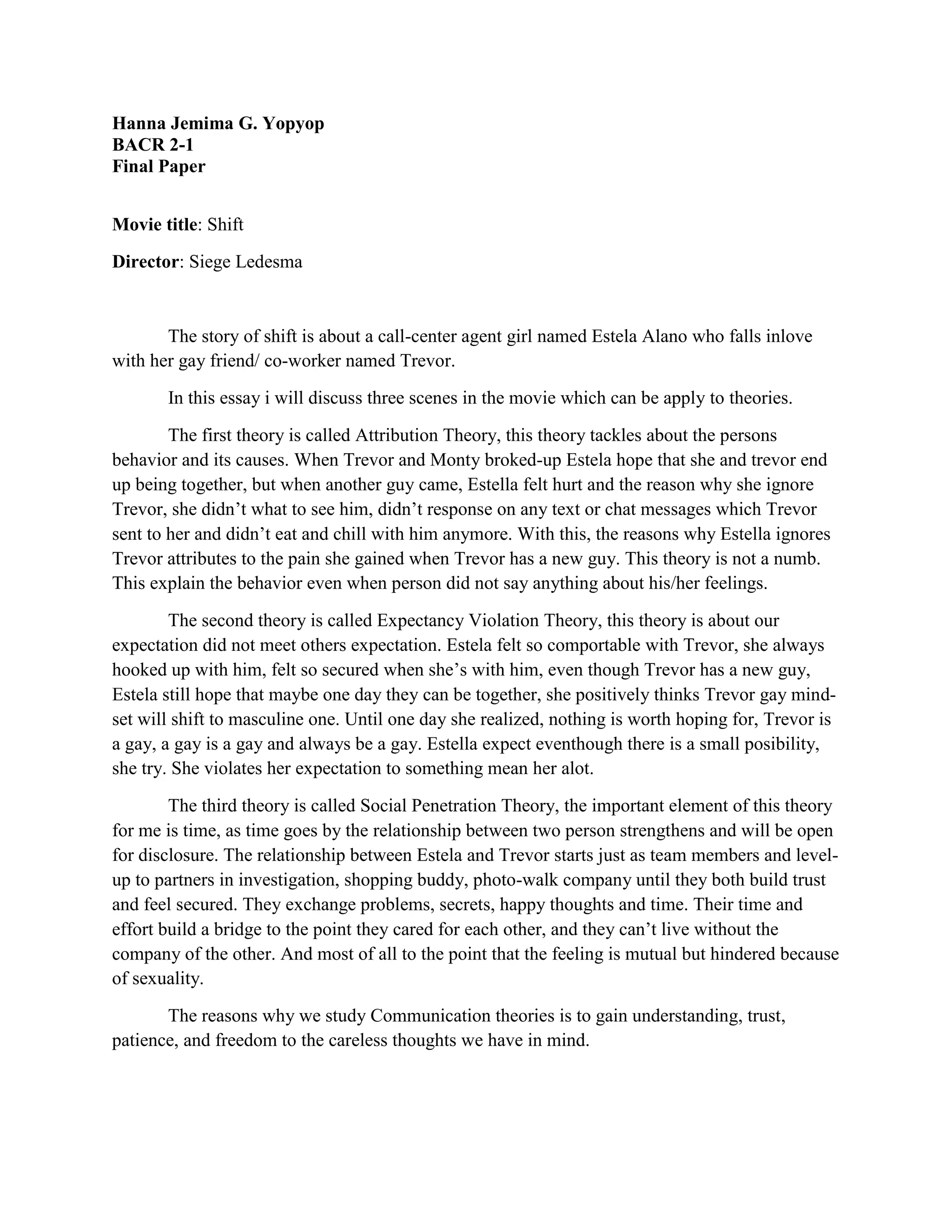 For the movie "Shift", the document discusses how Attribution Theory explains the behavior of the character Estela in ignoring Trevor after he starts seeing someone new. Expectancy Violation Theory is used to analyze Estela's expectations not being met. Social Penetration Theory examines the relationship development between Estela and Trevor over time.