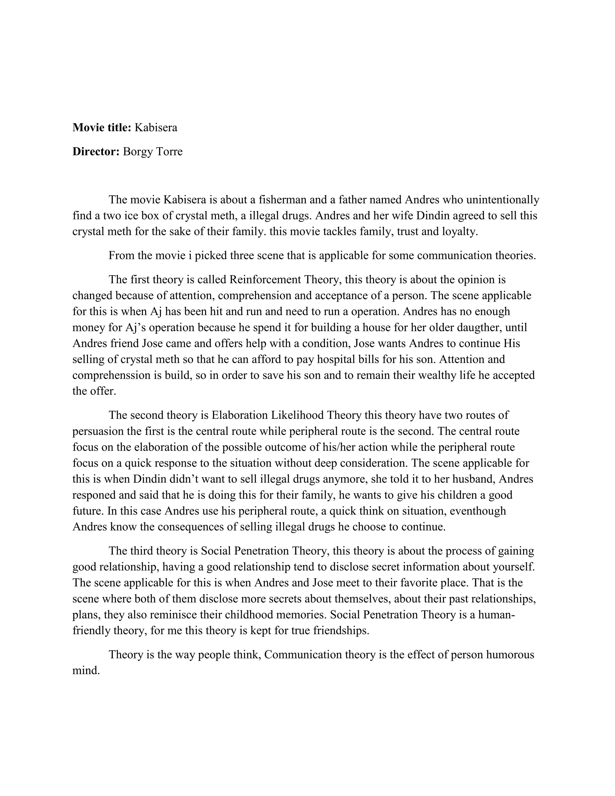 Scenes from "Kabisera" are connected to Reinforcement Theory, Elaboration Likelihood Theory, and Social Penetration Theory.