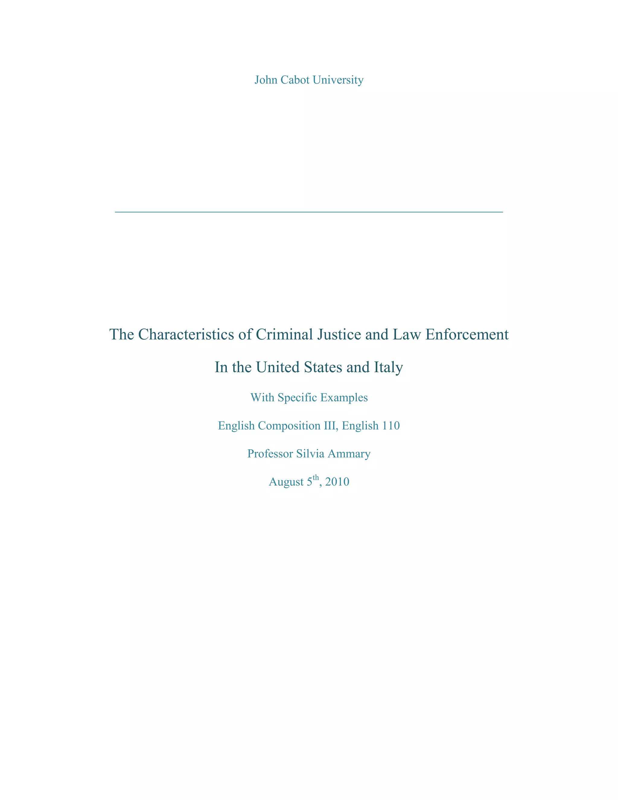 The document provides an overview of the criminal justice systems in the United States and Italy, highlighting some key differences. In the US, the system is based on common law and includes federal and state law enforcement agencies. Issues discussed include racial disparities, mandatory minimum sentencing, and cases of police brutality and corruption undermining public trust. Italy's system is based on Roman civil law and includes multiple national police forces overseen by the Ministry of Interior. Major figures who influenced the development of each system are also mentioned.