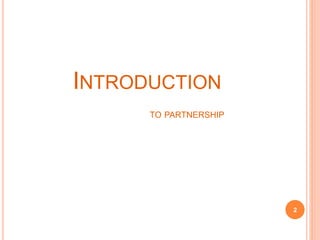 Partnership is a business structure where two or more individuals combine resources and share profits and losses as per a partnership agreement, governed by the Indian Partnership Act of 1932. It offers advantages such as easier capital acquisition, specialization in management, and flexibility, but also has drawbacks like difficulty in transferring interests, unlimited liability, and potential instability due to the personal risks involved. The document acknowledges contributions from individuals and provides contact information for associated campuses.