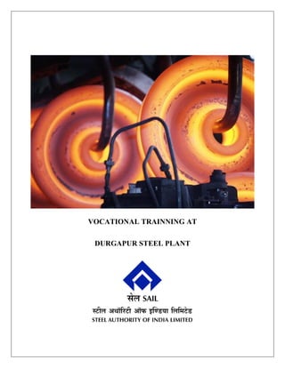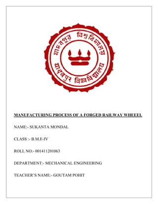 The document summarizes the manufacturing process of forged railway wheels at Durgapur Steel Plant in India. It describes the steel making process, wheel manufacturing, which involves casting ingots, heating billets, forging, rolling, machining and heat treatment. It also discusses testing methods like Brinell hardness testing and non-destructive testing to check for defects. Common wheel defects like wear, cracks and shelling are described along with factors that influence wheel life such as load, speed, track conditions and design.