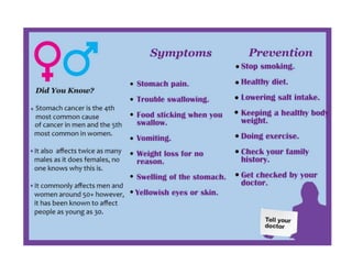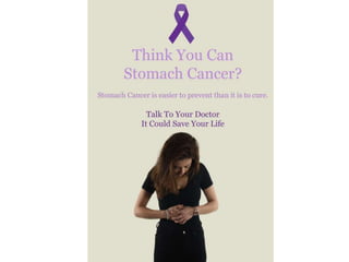 This document outlines plans for a stomach cancer awareness campaign including finalizing a logo, designing posters and leaflets, organizing a merchandise line, and hosting a cooking event.