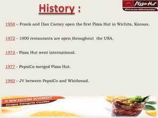 2) Pizza Hut focuses on quality, friendly service, and value for customers. It targets middle and upper middle class individuals and families.
