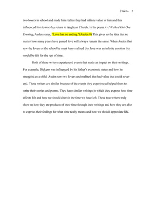 The document discusses how writers Charles Dickens and W.H. Auden reflect their times in their works, emphasizing themes related to the value of life and the impact of personal experiences. Dickens' upbringing and his father's economic struggles influenced his writing, while Auden's observations of love in a politically tumultuous environment shaped his poetry. Both authors convey the importance of appreciating the present and the enduring nature of love through their literary expressions.