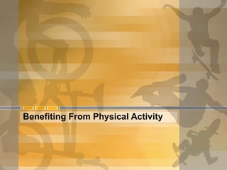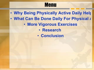 This document discusses the benefits of physical activity and provides suggestions for incorporating daily exercise. It notes that physical activity improves health, strengthens the heart and lungs, reduces stress, and increases longevity. Not being active can increase risks of disease, disability, and premature death. Simple daily activities like taking stairs, walking, and riding a bike are recommended. More vigorous options include running, swimming, and team sports. Research supports the importance of regular physical activity for overall well-being.