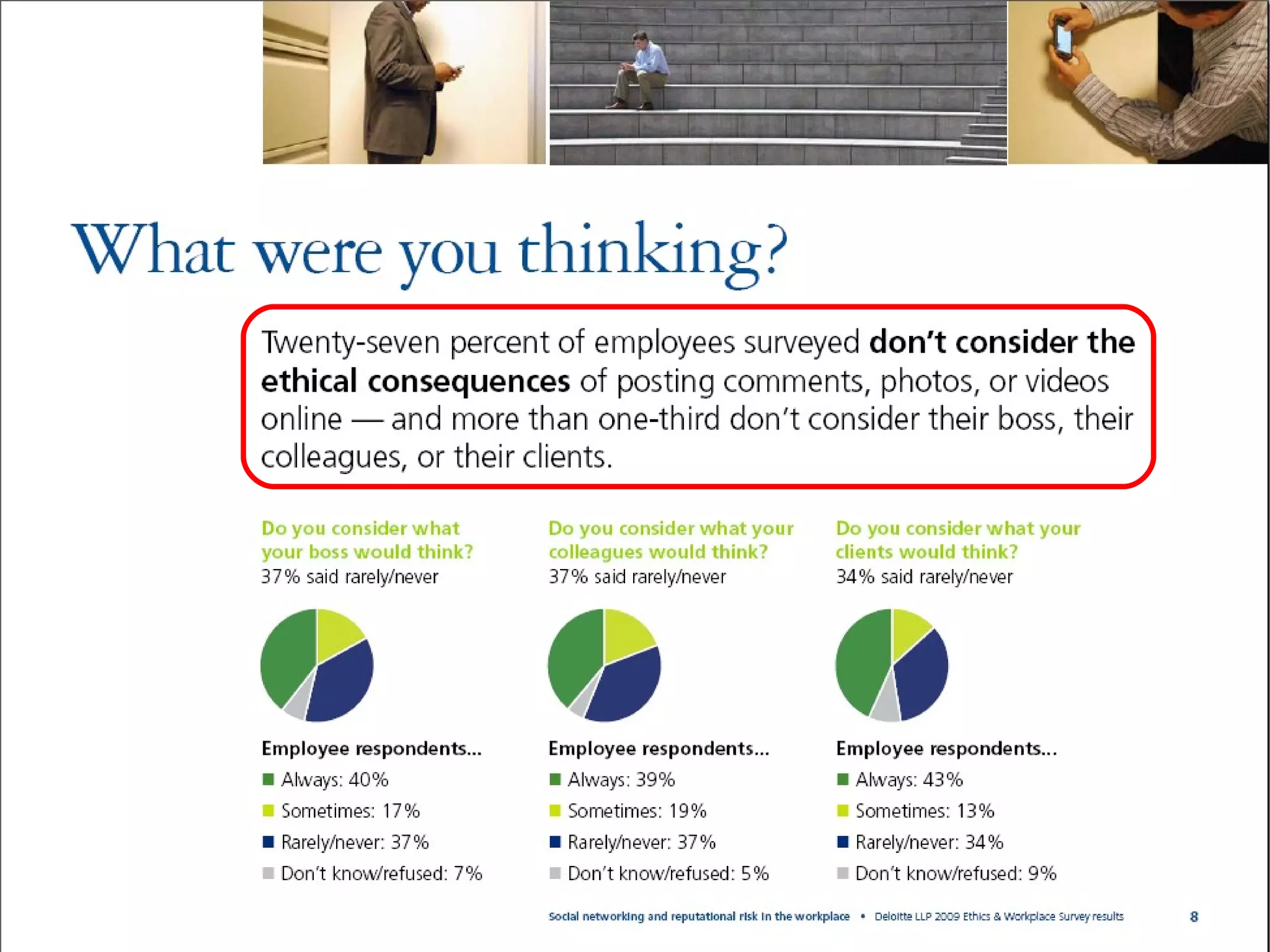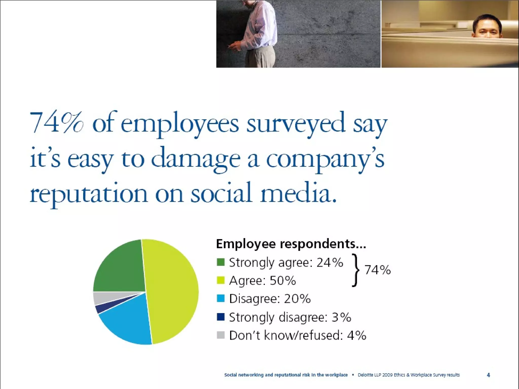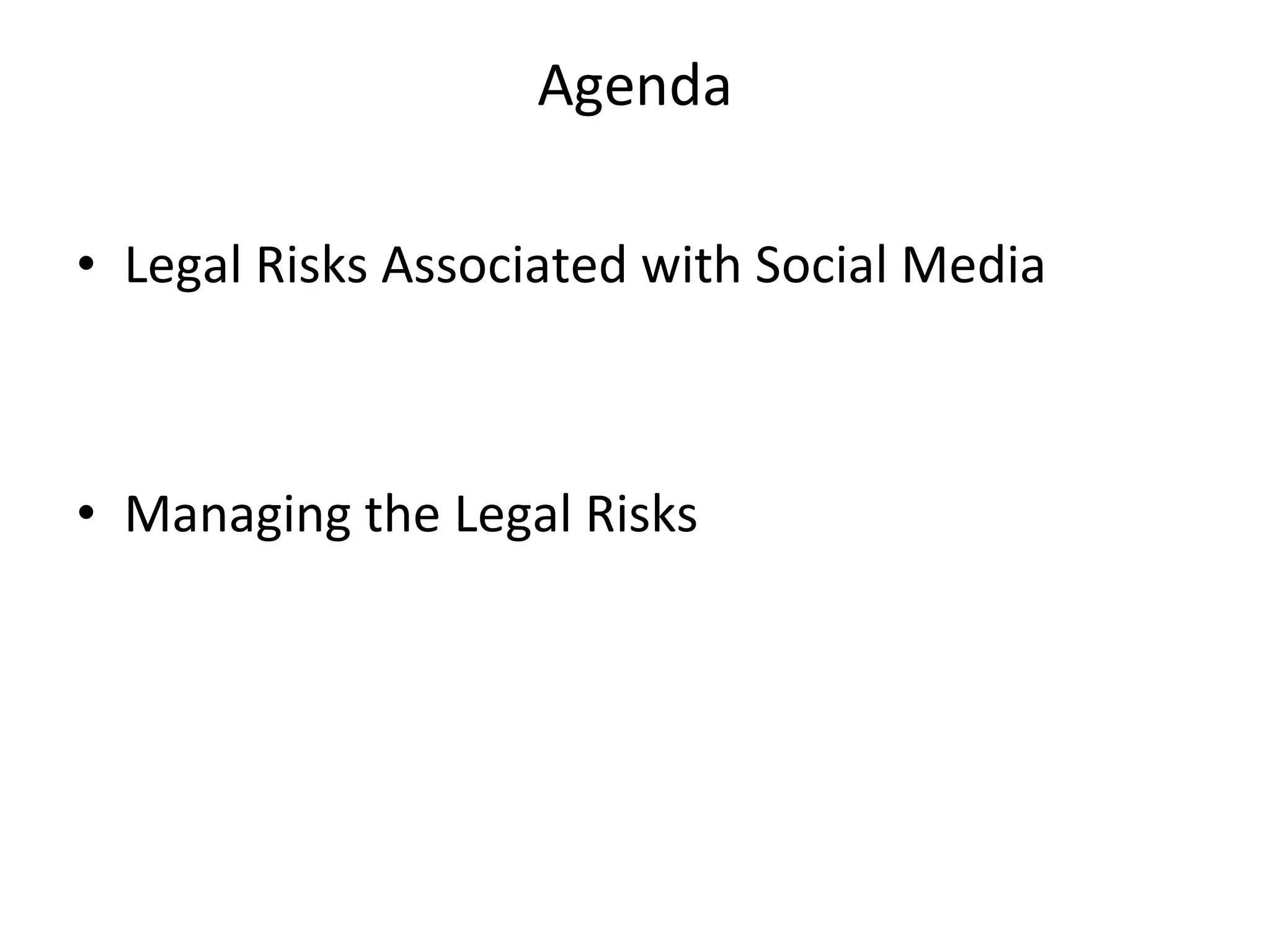 The document discusses the legal risks associated with social media use in the workplace, including employee privacy, discrimination, and wrongful termination. It highlights key court cases that demonstrate the employer's responsibilities and the potential liabilities for accessing employees' private social media accounts without authorization. The document also emphasizes the necessity for businesses to adopt comprehensive social media policies to mitigate legal risks and protect both employees and the organization.