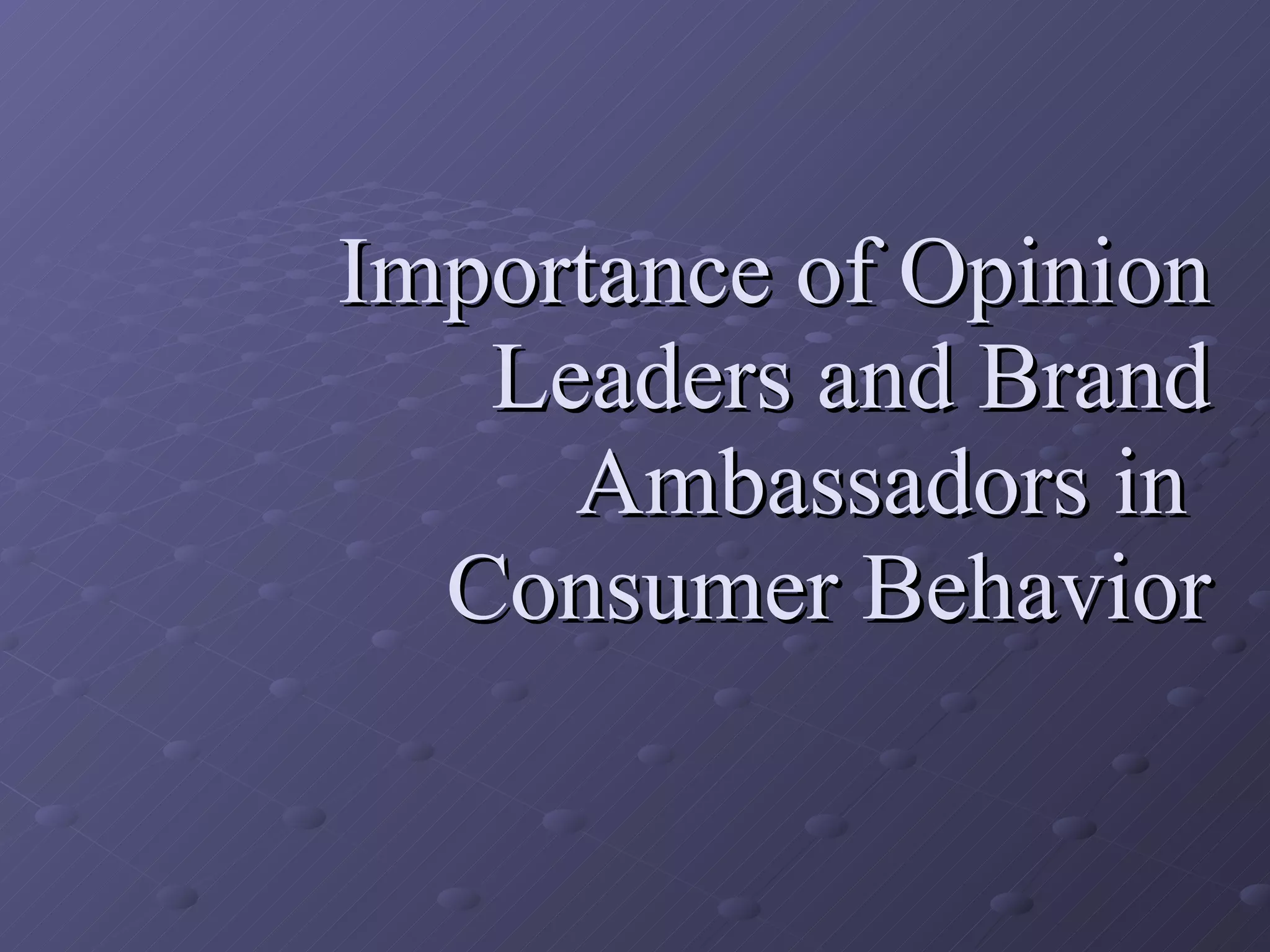 Brand ambassadors and opinion leaders are important influencers in consumer behavior. They increase awareness of brands, help create positive feelings towards brands, and provide word-of-mouth recommendations that reinforce consumer confidence. Effective brand ambassadors are those that have credibility with consumers and match well with the brand, such as using sports celebrities to endorse sporting goods. Opinion leaders act as trendsetters and brand referrals in categories like fashion and help spread information to other consumers.