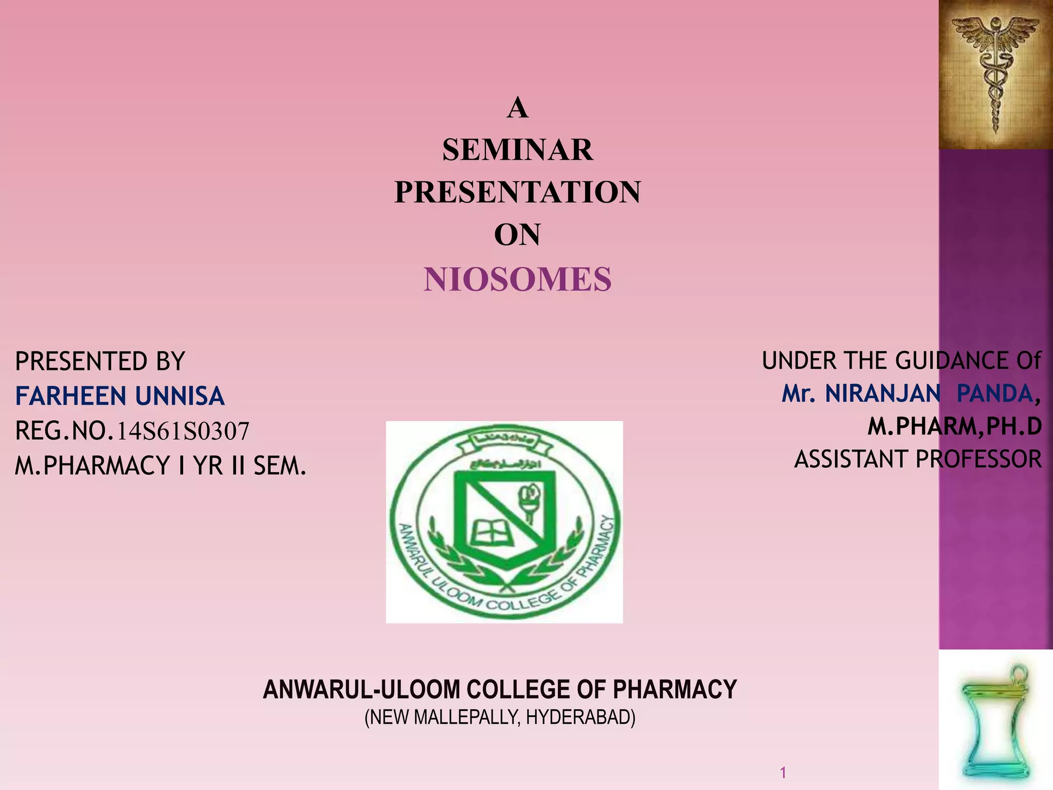 This document summarizes a seminar presentation on niosomes. Niosomes are non-ionic surfactant based vesicles that can encapsulate both hydrophilic and lipophilic drugs for drug delivery purposes. They have advantages over liposomes such as being less expensive to produce and more stable. The document discusses the structure of niosomes, factors that affect their preparation, common preparation methods, characterization techniques, applications for drug delivery, and their toxicity profile.