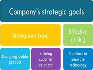 The document discusses launching an e-learning app called "TICKS & TRICKS" that provides students with quality education through online questions, puzzles, and tricks to help prepare for exams like the CAT, GMAT, and GRE. It outlines conducting market research, analyzing opportunities and threats, targeting smartphone users aged 18-35 and students taking exams, and implementing a free basic version and premium paid version of the app. The strategic plan includes distribution through app stores, social media promotion, tracking user preferences, and a timeline for market analysis, product development, and launch.