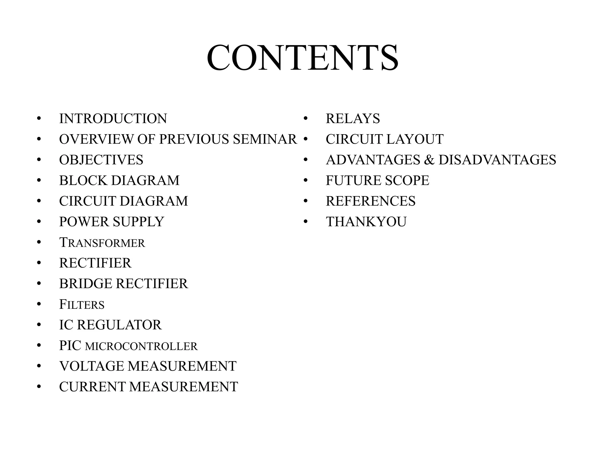 This document summarizes a student project on automatic load sharing of transformers using GSM technique. The objectives are to protect domestic and power transformers from overload by sharing the load between two parallel transformers when the load increases above a threshold. A PIC microcontroller monitors the current and voltage, and controls relays to disconnect one or both transformers if the load is too high. It can also send load information via text message using a GSM modem. The circuit includes transformers, rectifiers, regulators, relays, current and voltage measurement circuits connected to the PIC microcontroller. This helps prevent overheating, increases transformer life, and acts as an uninterruptible power supply.