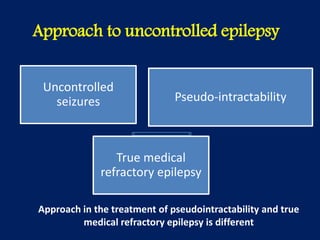 1) Uncontrolled epilepsy can be due to pseudointractability or true refractory epilepsy, requiring different treatment approaches.