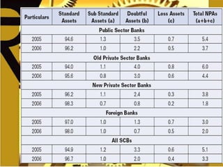 The Narasimham Committee, established in 1991, submitted two reports that laid the foundation for reforming the Indian banking sector. The committee recommended reducing statutory reserve requirements to improve bank efficiency and productivity. It also recommended phasing out directed lending programs, adopting uniform accounting practices, and increasing capital adequacy requirements. The 1998 Narasimham Committee report further recommended strengthening the banking system, experimenting with narrow banking, increasing capital adequacy ratios, and updating banking laws. The committees' recommendations helped spur the emergence of new private banks and opened up India's capital markets.