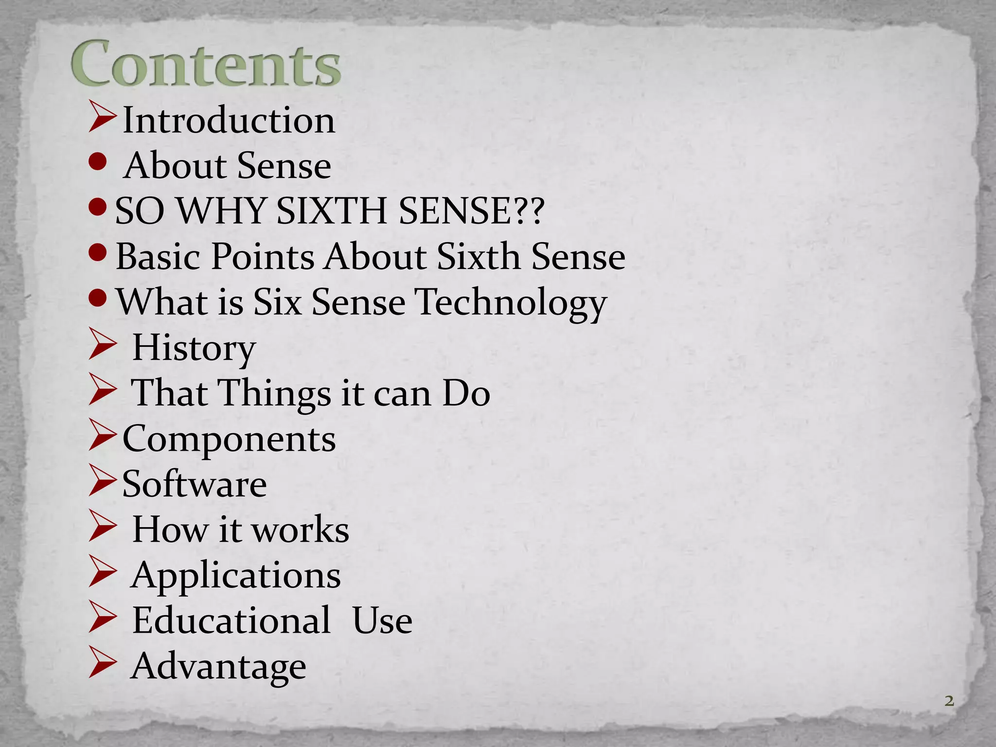The document describes the Sixth Sense technology, a wearable gestural interface developed by Pranav Mistry in 2009. It allows users to access digital information about the physical world by projecting it onto surfaces and interacting through natural hand gestures. The system uses a camera, projector, and mirror connected to a smartphone to recognize objects, gestures, and surfaces and display related data seamlessly overlaid on the physical world. Some applications mentioned include using gestures to draw, access maps and photos, and interact with projected interfaces on surfaces like palms or walls. Educational and other potential uses are also discussed.