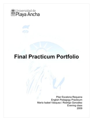This portfolio summarizes Pilar Escalona Requena's English teaching practicum at Pan American College in Viña del Mar, Chile in 2009, including reflections on her observation, team teaching, and solo teaching stages. It provides details on the school, classroom, students, activities, and her evaluations of teaching experiences and lessons learned.