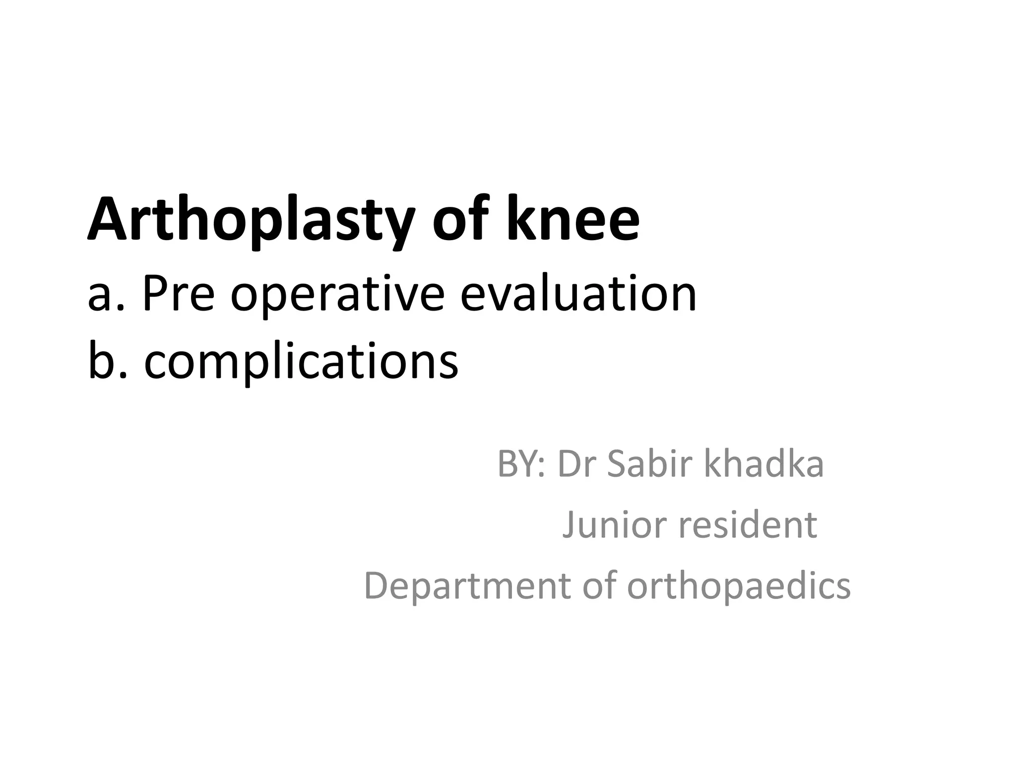 This document discusses the pre-operative evaluation and planning for total knee replacement (TKR) surgery. It covers indications and contraindications for the surgery, patient evaluation including history, physical exam, and imaging, optimization of co-morbidities, surgical planning including templating and sizing, education of the patient, and potential complications of the surgery such as thromboembolism. The goal of the pre-operative process is to adequately prepare the patient and surgical team so that the TKR journey begins with the initial patient meeting and ends safely at the operating room door.