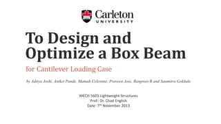 This document summarizes the process of designing and optimizing a box beam for cantilever loading. It outlines the goals of obtaining multiple design options, shortlisting acceptable designs, and optimizing the final design to maximize load to weight ratio. It then describes analyzing shear flow using calculations, considering manufacturing factors for the conceptual designs, and mapping stress concentrations and load path analysis. The document concludes that the final design will be chosen based on efficiency, weight, and manufacturability.