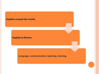The document discusses the importance of English, basic concepts related to language, communication, teaching, and learning. It notes that English has become important globally for business, education, and tourism. It is also emphasized as important for Mexicans to advance professionally due to economic ties with the United States. Key concepts covered include language as a means of communication, the importance of skills like listening and speaking for collaboration, and teaching and learning as an interactive process that helps acquire knowledge and skills.