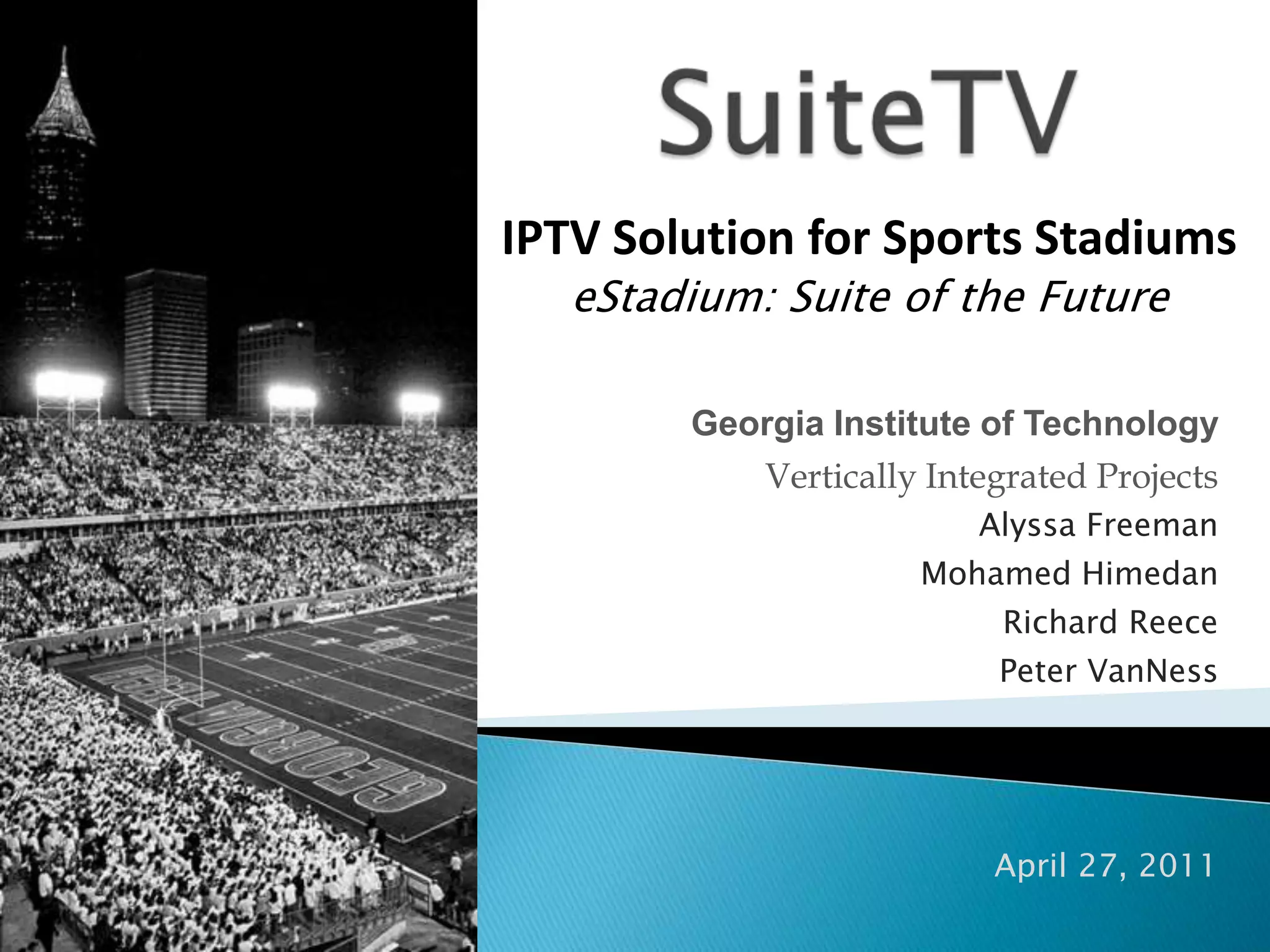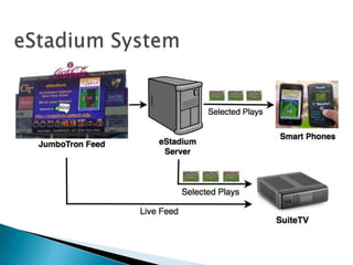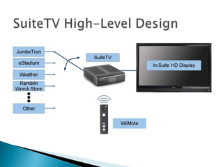 The document describes a set-top box called SuiteTV that provides an IPTV solution for sports stadium suites. SuiteTV uses open source software and hardware to display live video feeds, access interactive applications and websites, and provide a simple wireless remote control interface. It was designed and built by students at Georgia Tech to update technology in football stadium suites in a low-cost, sustainable way. The SuiteTV provides HD video streaming, wireless remote access, and integrates websites and applications through a Linux-based media player interface.