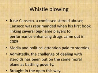 Steroid use in sports raises several ethical issues. It creates an unfair advantage for athletes who use performance-enhancing drugs. This breaks the implicit social contract that athletes will compete cleanly. It also damages the integrity of sports and role models when athletes cheat using steroids. While some argue steroids should be allowed to increase utility and happiness, this ignores the dishonesty of using banned substances and the effects on health and fair competition.