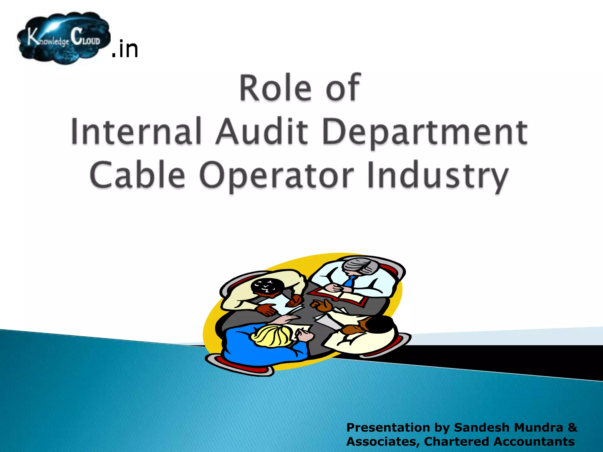 Internal auditing involves independently and objectively evaluating an organization's operations to improve efficiency and effectiveness. It assesses risk management, controls, and governance processes to help the organization achieve its objectives. Internal auditing adds value by bringing a systematic approach to evaluate and improve these processes. The document then provides examples of how internal audit evaluates areas like operational expenses, investments, and revenue leakage at a cable TV company. It examines processes for purchasing, stores management, and controls over expenses, capital expenditures, and revenue streams.