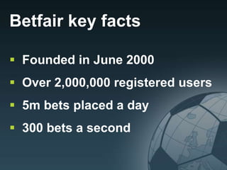 Betfair is an online betting exchange founded in 2000 with over 2 million registered users placing around 5 million bets per day. This document discusses how a mashup supports Betfair's brand values by representing the scale of Betfair, revealing its peer-to-peer nature, and empowering users through features like in-play betting and betting for or against outcomes. The mashup utilizes technologies like HTML, Flash, CSS, XML, and JavaScript as well as third party APIs from Google Maps, Betfair, Twitter and ESPN but has limitations around lack of integration and unreliable code.
