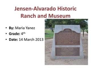 The document discusses a planned 4th grade field trip to the Jensen-Alvarado Historic Ranch and Museum. It outlines the standards and objectives covered, including how culture and experience influence people's perceptions of places. The materials, planning, and activities for the trip are also described, including touring the farm, making tortillas and butter, doing laundry, and writing an essay about how the experience influenced their understanding of life on a rancho.