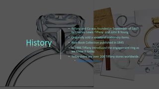 Tiffany & Co is a luxury jewelry company founded in 1837 that sells engagement rings, jewelry, and silver items. It has over 200 stores worldwide and is committed to environmental sustainability. Strengths include its rich history and brand recognition. Opportunities exist in expanding its global reach and online sales. Overall, Tiffany & Co demonstrates strong financial performance and brand loyalty, positioning it well for continued growth.