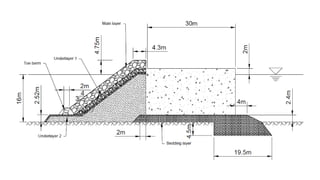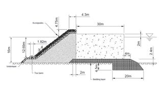 The document outlines a coastal engineering project aimed at expanding Port Moín in Costa Rica, including the design of a breakwater and additional wharf facilities to accommodate larger container vessels. Feasibility studies and numerical modeling were conducted to ensure safety, efficiency, and economic viability, projecting significant profit growth. Final designs and construction methodologies were evaluated based on various alternatives to enhance the port's capabilities and meet future demands.