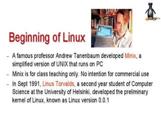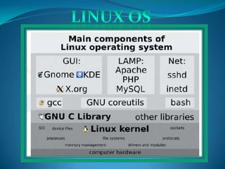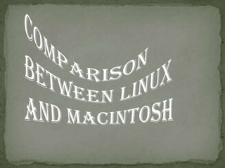 The document compares Windows, Linux, and Macintosh operating systems. It provides introductions and descriptions of each OS, including their origins, features, and technical specifications. It discusses advantages and disadvantages of Linux and Windows, and provides a comparative view of Windows vs Macintosh. The summary compares Linux and Macintosh, noting Linux has more customizability and security while Macintosh is easier to use but more expensive.