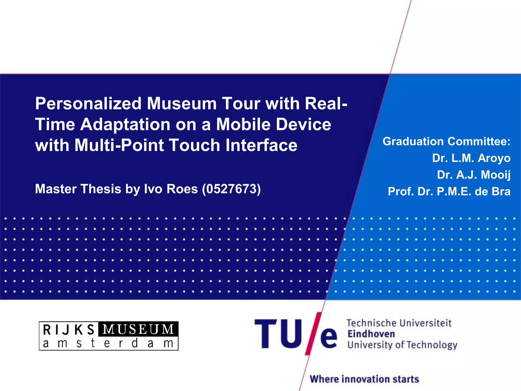 This document summarizes a master's thesis on developing a personalized mobile museum tour with real-time adaptation. The thesis aimed to improve on an existing offline personalized tour system by enabling real-time user positioning and tour adaptation based on time constraints, artwork preferences, and spatial information within the museum. It investigated using WiFi radio frequency fingerprinting for real-time localization, which achieved accuracy within 1.25 meters. The mobile tour system was designed to adapt the recommended artworks and tour pathing in real-time based on the user's profile and detected location within the museum.