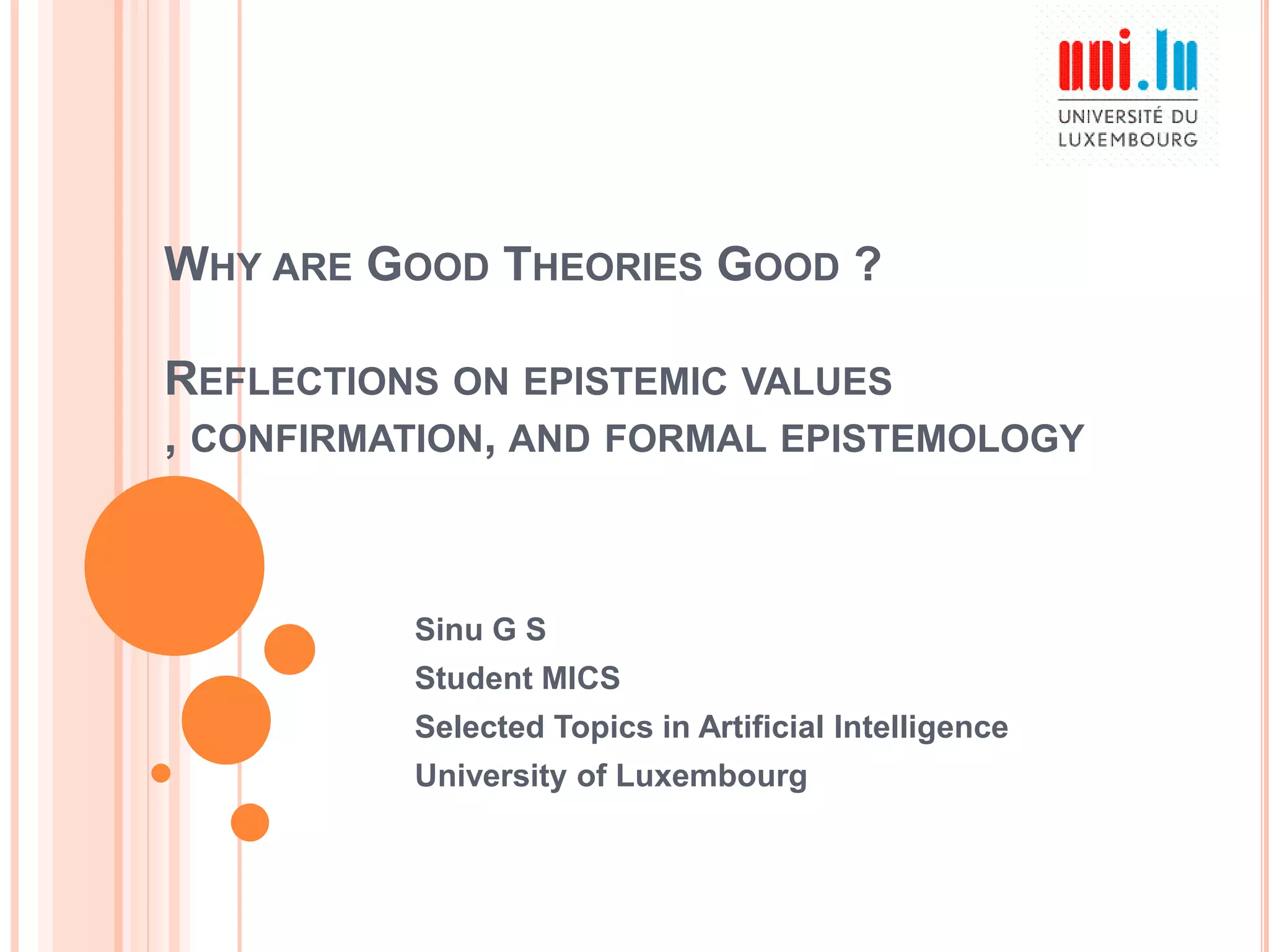 The paper explores various theories of confirmation, comparing the theory of confirmation with the theory of verisimilitude, and examines the connections between confirmation, naturalism, and the belief framework for cognitive agents. Key topics include different approaches to confirmation, problems related to evidential support for theories, and Huber's evaluation of theories based on their informativeness and plausibility. The discussion emphasizes the importance of coherent and predictive theories in the context of empirical evidence.