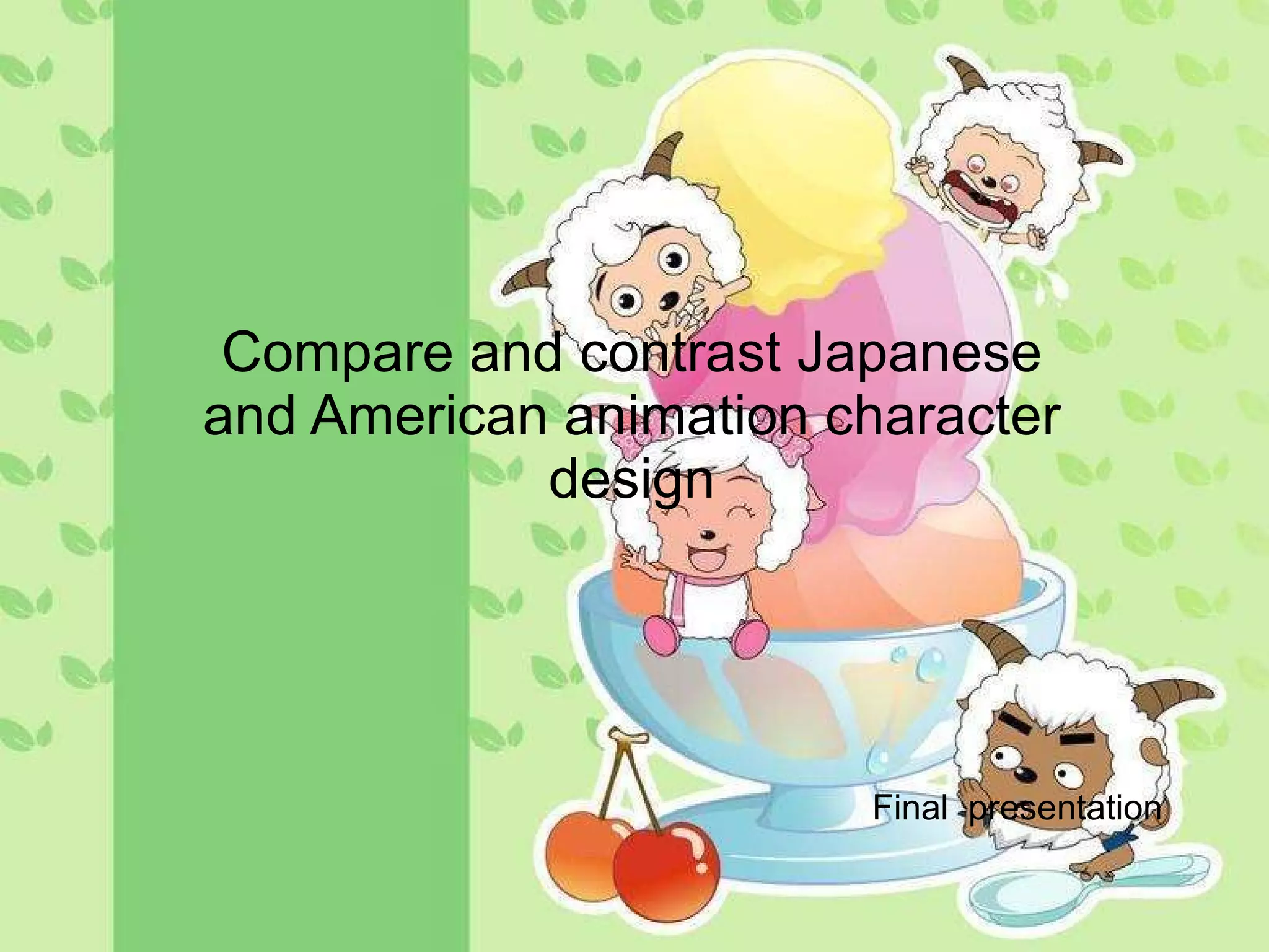 The document compares and contrasts Japanese and American animation character design. Japanese animation character design pursues aesthetic perfection with tall, handsome males and females with long hair, small noses, and exaggerated eyes. The designs are delicate and focus on realism and humans. American animation has simpler, more exaggerated proportions that are closer to reality and audience size/appearance. Materials are broad but content is less diverse. American animation is mostly 3D which allows for more artistry but also higher costs due to more frames needed per action.