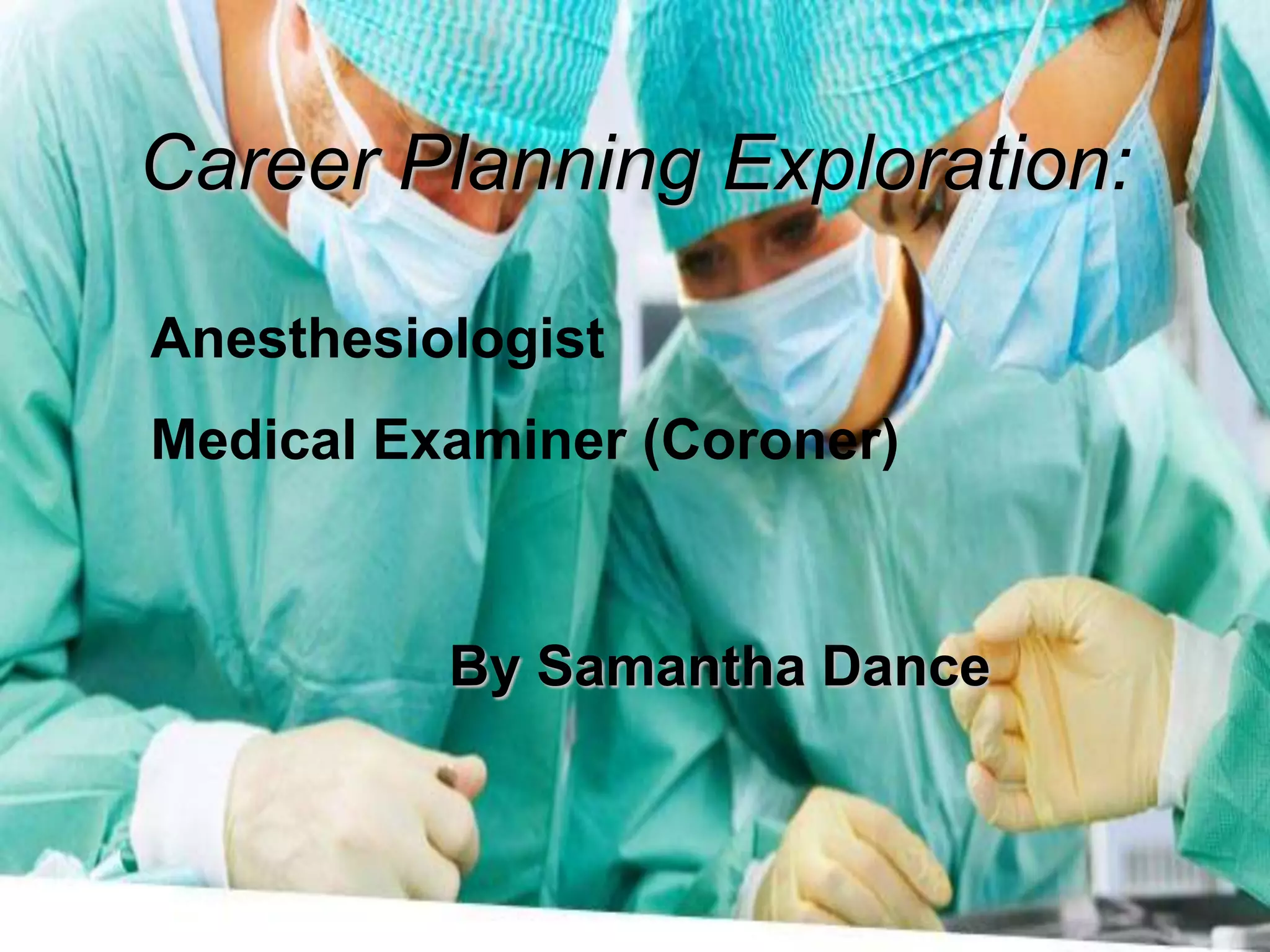 The document discusses career options in the medical field based on Holland Code personality assessments. It describes the roles of medical examiner and anesthesiologist. A medical examiner performs autopsies to determine causes of death and works with law enforcement. An anesthesiologist administers anesthesia during surgeries and manages patients' vital signs. Both require extensive education and experience. Potential employers for related roles are also listed.