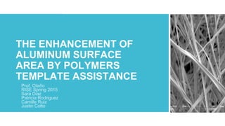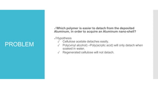 This document discusses using different polymers as templates to enhance the surface area of deposited aluminum for cancer treatment applications. The researchers tested cellulose acetate, poly(vinyl alcohol)-poly(acrylic acid), and regenerated cellulose as templates. They used electrospinning and sputter deposition to deposit aluminum onto the polymer templates. While they were able to deposit aluminum onto the fiber surfaces, they had technical issues and were unable to prove which polymer would be easiest to detach, leaving the hypothesis unproven. Future work would involve electron microscope analysis of the fiber morphology and comparison of optimal templates.
