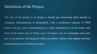 The document provides a detailed analysis of a chemical processing unit, including component mole fractions, equipment specifications, and mechanical designs for separators, heat exchangers, and demethanizers. It outlines economic analysis with capital costs, profit estimates, and feasibility metrics such as internal rate of return. Overall, it offers a comprehensive overview of equipment design and economic viability for the facility's operations.