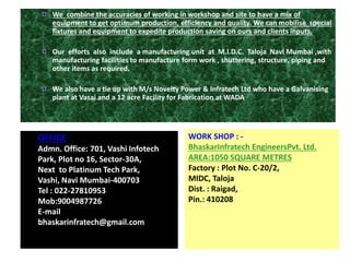 This document provides information about Bhaskar Infratech Engineers Pvt. Ltd., an engineering company that specializes in structural fabrication and erection. It lists the company's areas of expertise, key personnel, machinery, and details of past projects involving structures, industrial sheds, warehouses, marine works, and more. The company aims to provide accurate and efficient fabrication and erection services using its workshop and on-site equipment and experienced workforce.