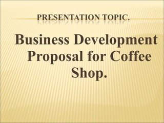 The group presented a business development proposal for a coffee shop called Coffee Spot Café. The café will offer a variety of coffee drinks, teas, and homemade snacks at reasonable prices in a friendly atmosphere. The goals are to become well-known locally and potentially expand to other locations. The café will be run as a sole proprietorship by the group and located rent-free in Uttara, with a startup cost of 97,500 Taka. To break even, the café needs to sell 5,417 cups of coffee.