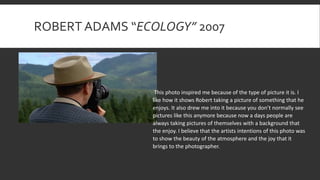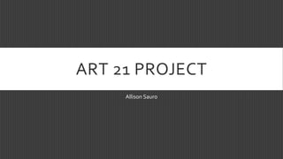 This document discusses several artworks from the ART 21 PROJECT by Allison Sauro. It summarizes Sauro's responses to and interpretations of photographs by Robert Adams, Marina Abramovic, and Eleanor Antin. Sauro took her own photographs in response to the themes and messages of the original artworks. Her self-portrait "Selfie" responded to Robert Adams' photograph of nature photography. Her photo "The Light" was a gender-equal response to Marina Abramovic's artwork about overcoming hardship. And her photo "Equality" portrayed her and her boyfriend side by side to challenge Eleanor Antin's message about traditional gender roles.