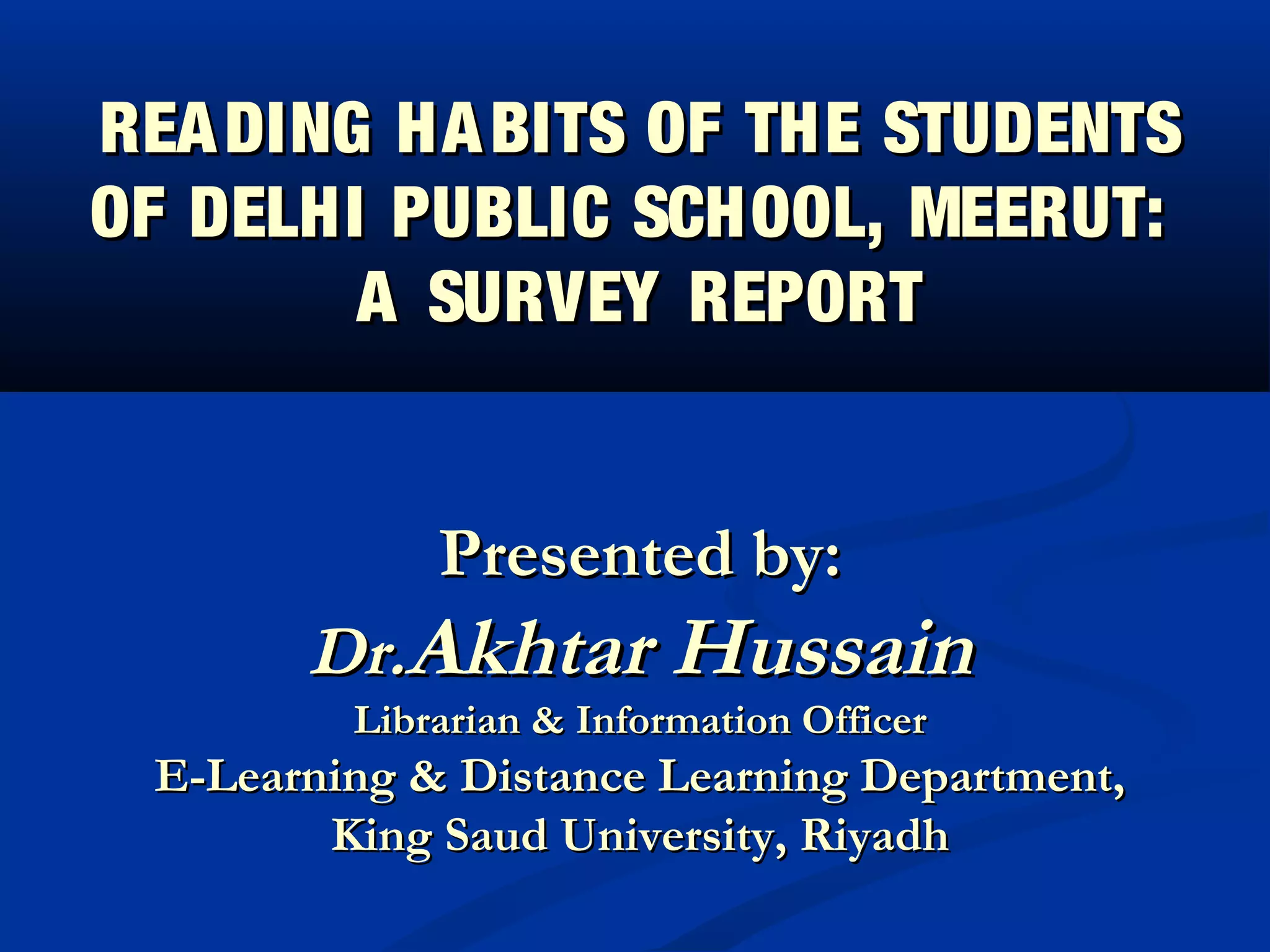TTHHEE SSTTUUDDEENNTTSS OOFF DDEELLHHII PPUUBBLLIICC SSCCHHOOOOLL,, MMEEEERRUUTT:: AA SSUURRVVEEYY RREEPPOORRTT PPrreesseenntteedd bbyy:: DDrr..AAkkhhttaarr HHuussssaaiinn LLiibbrraarriiaann && IInnffoorrmmaattiioonn OOffffiicceerr EE--LLeeaarrnniinngg && DDiissttaannccee LLeeaarrnniinngg DDeeppaarrttmmeenntt,, KKiinngg SSaauudd UUnniivveerrssiittyy,, RRiiyyaaddhh